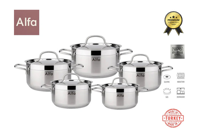 طقم قدور للطبخ ستانلس ستيل عالي الجودة ثقيل صناعة تركية 18 على 10 من براند ألفا ALPHA مكون من 5 جدور بقاعدة سميكة للتوزيع الحراري قياسات الطقم : 32 و 24 و 22 و 20 و18 ستانلس بالكامل مع غطاء منفصل لكل قدر في الطقم