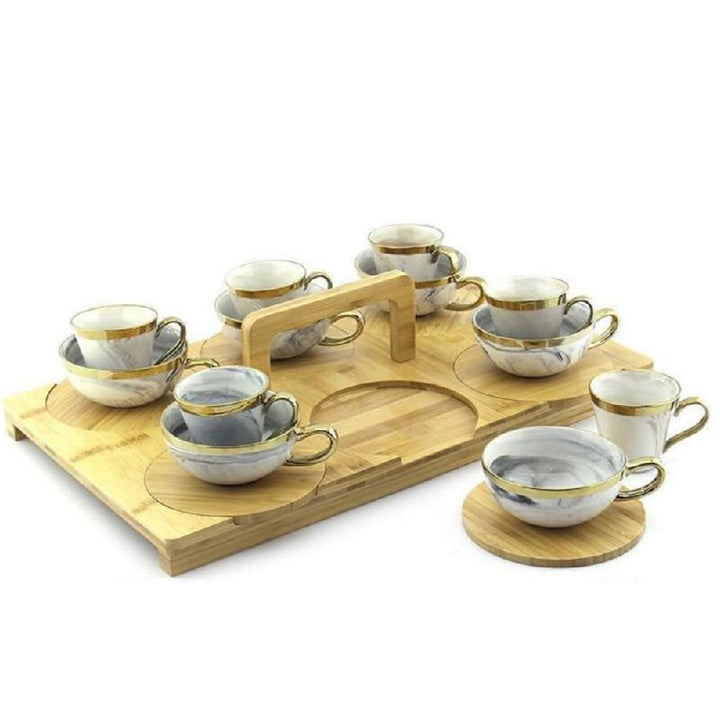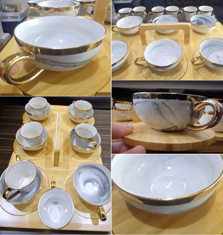 طقم فناجين ماربل مع طاولة تقديم خيزران 😍 6 فناجين كبار حق الشاي 250 ملو6 صغار حق القهوة ☕️ والطاولة مو بس كشخة، داخلها 6 أطباق يخبلون 💫 فيها مسكة للتقديم والضيافة، وكل من يشوفها بيسأل من وين شريتيها 😉 وسعرها بعد وايد حلو